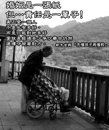 一個即將升職的男人,因為她老婆突然患了老年癡呆症 朋友們建議他把老婆送到醫院治療兼療養 他考慮了一星期後,遞出了辭呈 朋友們都很錯愕,紛紛詢問他為什麼要放棄升遷的機會呢? 他的人生就將要達到最高峰了啊! 他說:我只想到我在神前面承諾過 不論她貧窮、疾病、變老變醜 我都要愛她、照顧她一輩子 ☆。Lily ♥ 玲。☆ 發表在 痞客邦 留言(27) 人氣(10)
